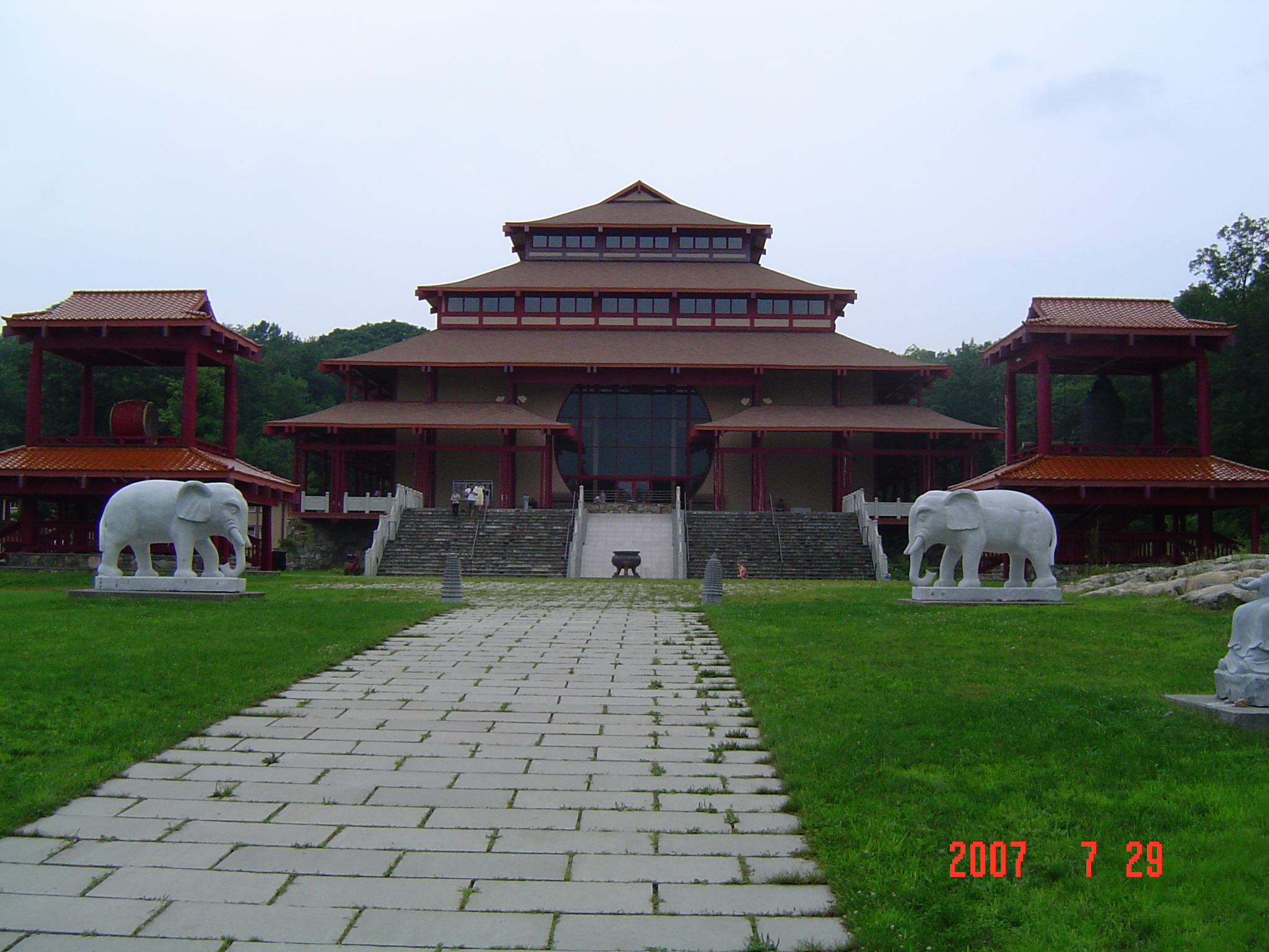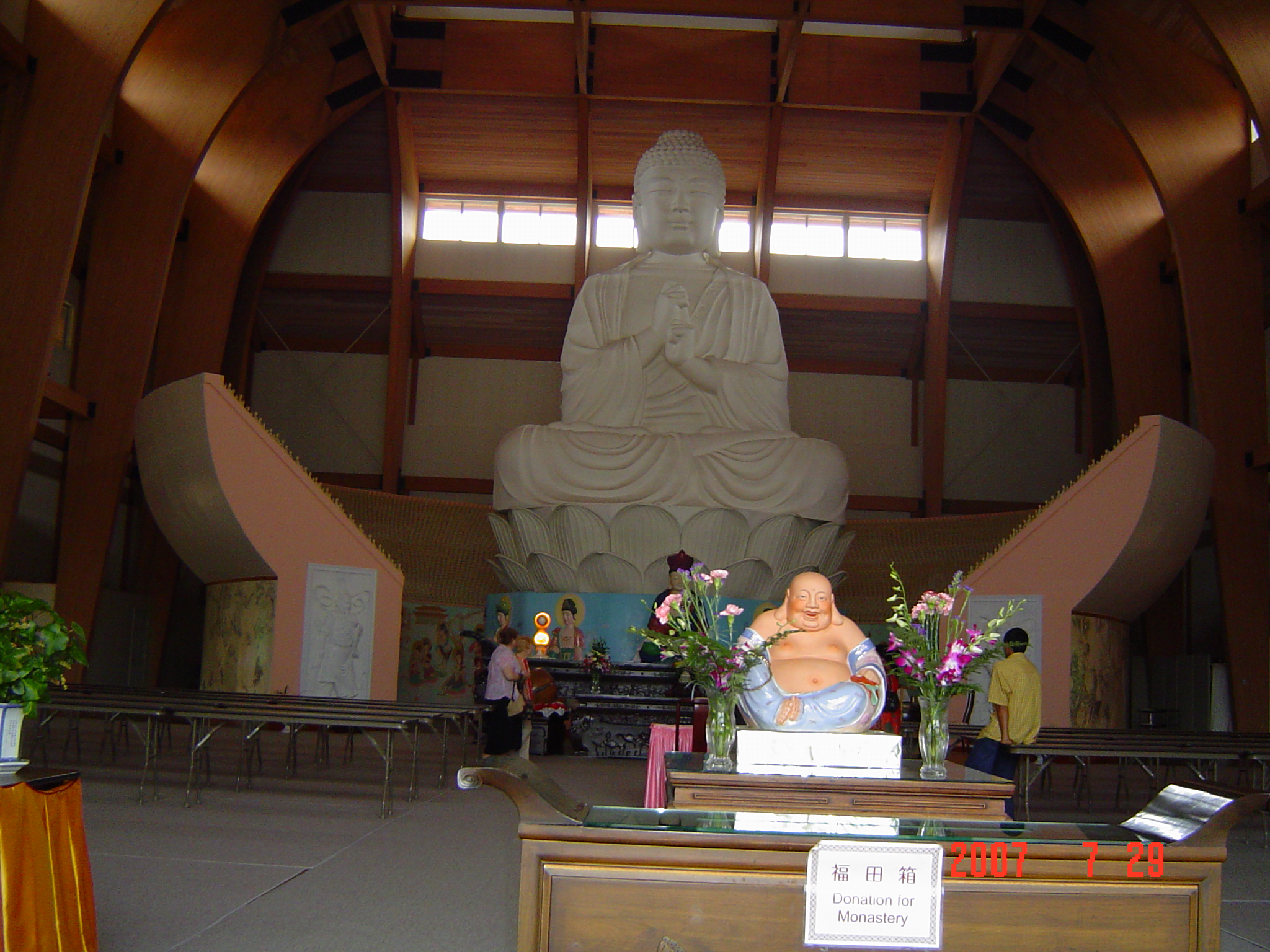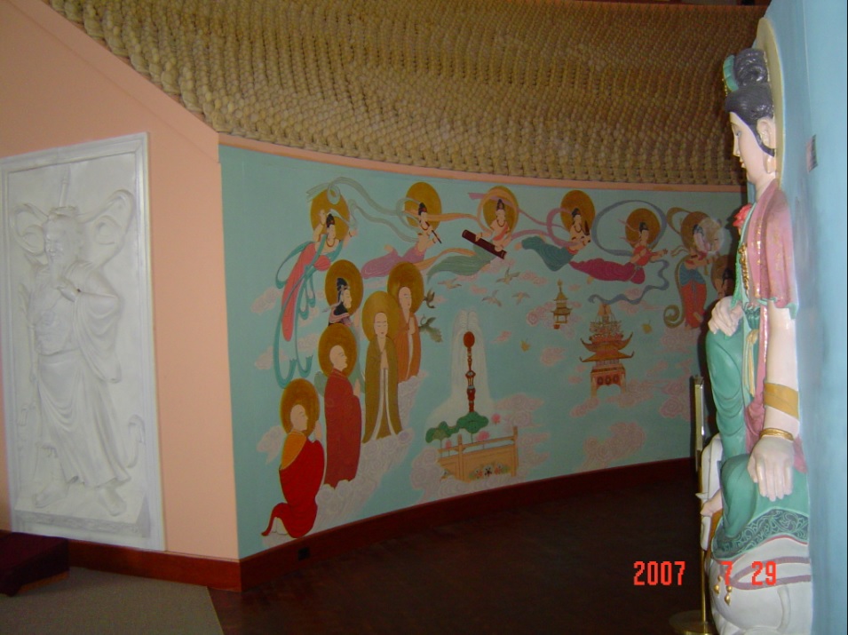 CHUANG YEN MONASTERY, the biggest Buddha statue in the East Coast of USA, www.baus.org; 18 images: 1, 2, 3, 4, 5, 6, 7, 8, 9, 10, 11, 12, 13, 14, 15, 16, 17, 18; Inside 2.jpg, 2 statues in front of Buddha are, Guanyin, and adaptation of the Maitreya, a.k.a. the Future Buddha, a.k.a. the Laughing Buddha, a.k.a. the Milefo, worship for affluent life, happiness, ... ;