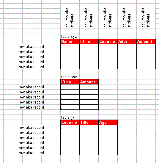 | Code no | < 5 characters | table xyz; table i j k; |
