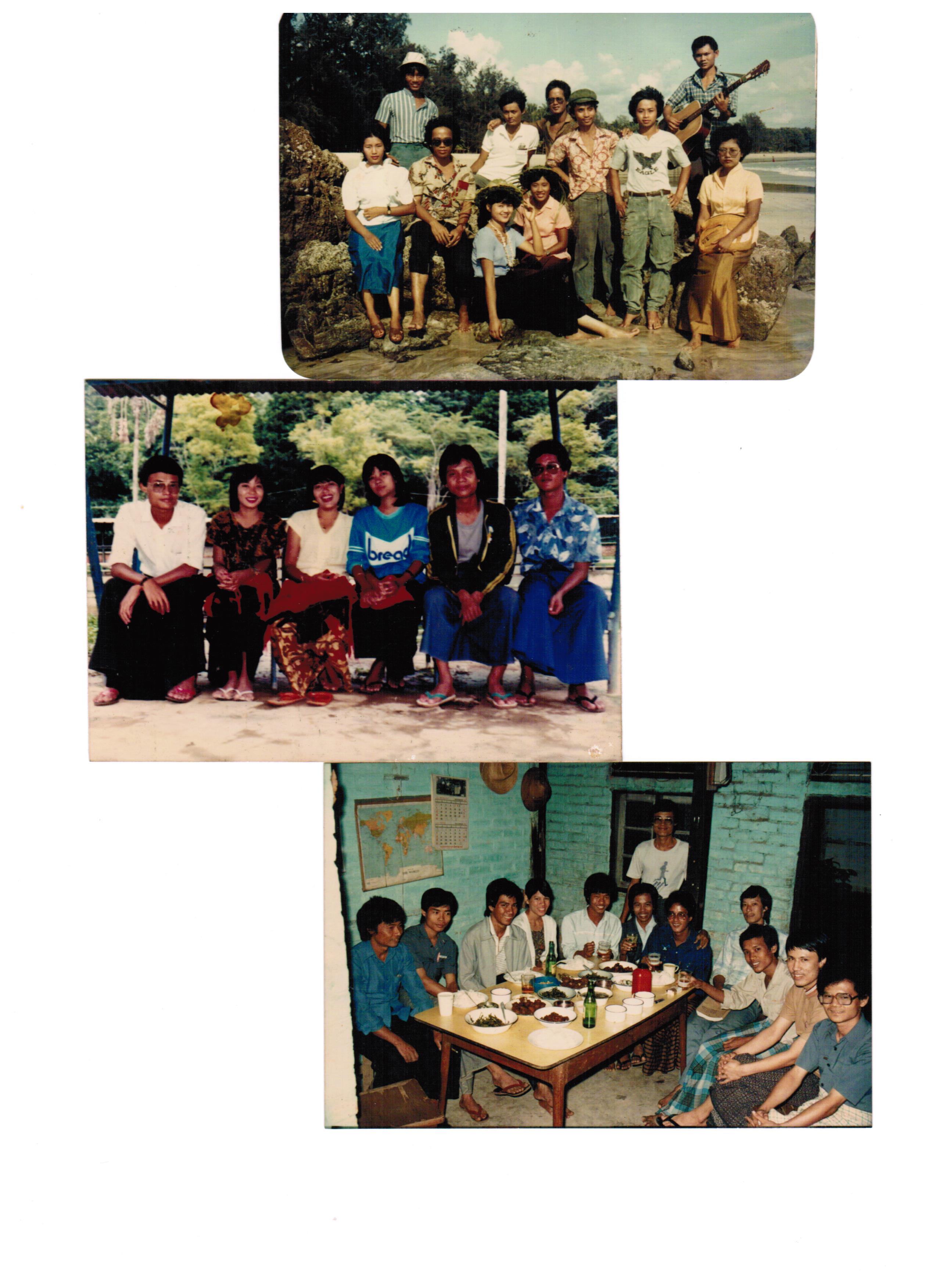 | 1986-87; | top; Ngapali beach, Rakhine State, Myanmar, in 1986, left-to-right: ChoChoWin; TheinSoe; PeAung; SanSanPhyu; AungMyintKyaw; MyintMyintKyi; HlaWin; KoNgaTa; MaungMyint; HlaMin(SunNi); KhinKhinThet; | 30+ years later, as of 2017, one of the results of democratic government management, global HILTON as Hilton Ngapali Resort & Spa (4.5 stars resort hotel); Recommended route: 50 minutes flight from Yangon to Thandwe; |